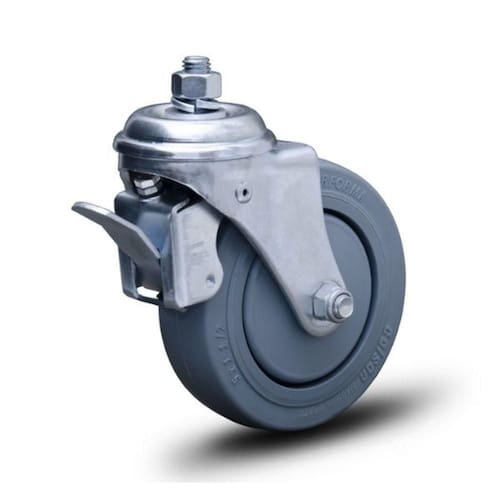 Rodízio Performa Giratório Aço Inox 4 Pol C/ Freio E Espiga Suporte com construção reforçada proporciona trabalho silencioso com absorção de vibrações, proteção ao piso e à carga, ainda permite facilidade e conforto em manobras manuais, material exclusivo com alta resistência ao desgaste.Rodízio para carrinhos e dispositivos de movimentação manual em indústrias, comércios, oficinas e centros de distribuição.Roda:: Banda em material termoplástico macio (cinza), núcleo e calotas em polipropileno (Cinza) e rolamento de esferas Dureza 75 Shore A (-40C a 50C).Garfo:Em aço com 3,75mm de espessura, acabamento zincado branco e duplo rolamento de esferas.Capacidade de carga: 110kgModelo: GiratórioDiâmetro: 4 PolegadasLargura da banda da Roda: 1.1/2 PolegadasComprimento do cubo: 48mmTipo de rodagem: esferasRaio de giro do rodízio: 94mmAltura total: 134mmParafuso do eixo: 7/16 Polegadas