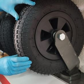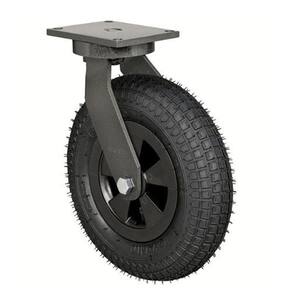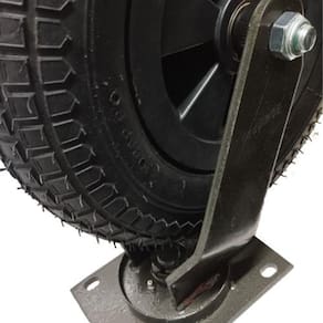 Rodizio Pneumático 350-8 Carrinho De Carga 4 Lonas Schioppa Especificação do Rodizio Pneumático 350-8Rolamento do Garfo: Rolamento axial 51105;Eixo: Parafuso Sextavando 3/4 x 6 unc;Manga de Eixo: Nylon;Dimensões gerais:Largura da roda: 95 mmDiâmetro da roda: 385 mmAltura Total: mmCapacidade de carga: 220kgPeso Total por Rodizio: 8.500 kgAltura até o centro do eixo: 121mm;Raio de giro até o centro do eixo: 118mm;Dimensões da placa: 200mm x 150mm;Distância entre furos: medida mínima 145mm x 125mmMedida máxima 157mm x 125mmFuro 13mm;Diâmetro do eixo: 19,5mm;Calibragem: 50 LBGARFOReforçado, fabricado em aço carbono SAE 1010/20 com peças estampadas e usinadas, cabeçote com dois rolamentos axiais de esferas. Acabamento pintado de cinza martelado. Eixo da roda parafusado. Graxeira da lubrificação e o giro é feito através de uma pista de esfera e rolamento axialPP Pneumáticas Núcleo de Nylon. (-20C a +50C). Fabricadas com pneu 4 lonas, câmara de ar e núcleo injetados em nylon. Indicadas para aplicações em pisos irregulares onde é necessário facilidade de movimentação e amortecimento dos impactos e vibrações. Proporcionam fácil manutenção, e seus componentes podem ser fornecidos separadamente. A velocidade de trabalho indicada é até 4 km/h