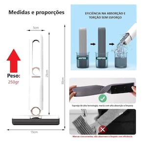 O destaque desse produto é o seu sistema de torção inteligente, que permite recolher o rodo de absorção com apenas uma mão, sem esforço algum. Além disso, o mesmo movimento de recolhimento também faz a torção do rodo, eliminando todo o líquido. Com isso, você economiza tempo e esforço na hora da limpeza.