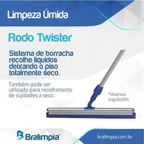 Rodo Twister 45 Cm Sem Cabo Rt450 Refil Bralimpia Informações Adicionais: Modelo: Rodo Twister Código: RODOTWISTER-001-SEMCABO - Categoria: Materiais Limpeza Cabos / Rodo / Vassouras Peso: 387 - Dimensões C x L x A : 48 x 10 x 12 Características: - Seu sistema de borracha com canto permite recolher líquidos, deixando o piso totalmente seco com menos esforço. - É o único rodo que também pode ser utilizado para recolhimento de sujidades a seco em locais como salas limpas e hospitais. - Produzido em alumínio e borracha nitrílica que permite a troca da lâmina. - Este equipamento foi projetado para espaços e lugares onde haja a necessidade de angulação do cabo; como para limpar embaixo de gôndolas e mobílias e área restritas. Especificações: - Largura: 48 cm - Altura: 12 cm - Peso: 0,380 kg - Circunferência do cabo: 1,5 cm Ean: 7898319322882