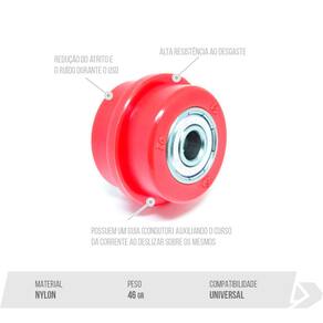 O rolete de corrente Biker possui um canal por onde a corrente passa, ele é projetado para que os elos se encaixem perfeitamente impedindo que ela escape durante sua pilotagem.