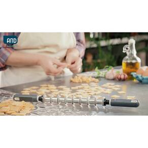 - Ideal para cortar massas manualmente (ravióli e agnoline); - Possui 9 lâminas (corta 8 tiras de massa por vez); - Largura do corte 2,90cm; - Cabo com detalhe de apoio, proporcionando maior firmeza e segurança no manuseio; - Cabo com furo passante para pendurar o utensílio; - Design moderno e inovador com cores diferenciadas; - Rolo desenvolvido em aço cromado; - Cabo do rolo em polipropileno; - Prático e fácil de usar.