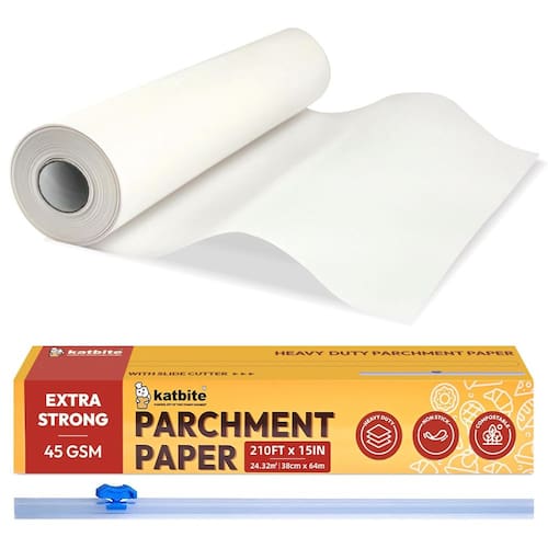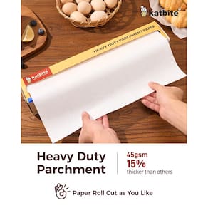 Multifunctional products Whether you are a professional baker or novice, Heavy duty parchment paper bulk roll is perfect for many users! Non-stick baking paper can be used to baking cake and pizza, also can separate frozen patty, trust us, they can accomplish their mission well. - Other uses: Tortilla Press, Dehydrator, Dutch Oven, Steamers, Air Fryer, High standard product quality High quality products can avoid problems in your working process, which will not burn. If you are not satisfied with it, please tell us, but we are sure, most of you will love it! What’s In the Box? Buy one pack, you will receive(get) 15 in x 210 ft, 205 SQ FT white parchment paper inside. - EASY TO TEAR WITH SLIDE CUTTER: Katbite parchment paper roll with cutting racks can be used for half sheet or full sheet baking pan. The width of the 15 inch baking sheet paper determines that you can cut into 12x15 inch size, it can also be cut into 15x24 inch, its adaptability is very good, and the rack that comes with the box can help you cut freely, no need to cut with scissors, very easy to use. With a length of 210 ft total in 260 SQ FT, very durable and useful. - HEAVY DUTY & EXTRA STRONG: Katbite baking parchment paper made of extra thicker 45gsm paper vs commonly used 35gsm or 40gsm paper, it's about 12% thicker than others. We define it as heavy duty parchment paper. You will find that our paper is more thicker and stronger than normal wax paper roll. You can touch it by hand or measure it with a kitchen scale. It is excellent value for money. The characteristics of heavy duty make it difficult to break, so it can carry more food and convenient. - HEALTHY & NATURAL: KOSHER certificate approved. 15 inch baking parchment paper is made from natural 100% wood pulp and totally fluorescent free. Food grade unbleached parchment paper with two side food grade silicone coating makes your baking easier. - NON-STICK & EASY TO CLEAN: Do you love baking but hate cleaning up? This nonstick parchment paper makes it possible and even works great! Food can be easily slide off from the baking tray and you just need to remove the baking paper and throw it away after baking. Even wet dough won't stick to it. - MULTI-USE & OVEN SAFE: Do you think parchment paper for cooking is only used for food baking? NO! Because Katbite high heat parchment paper temperature resistance is from -68° F to 425° F, you can find it everywhere in kitchen whether in heat press, cake pan liners, freezer, microwave, oven baking, grilling or air fryer as long as you can think of it. Cooking papers can be used for baking cakes, cookies, breads, meat, desserts.,etc.