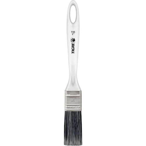 Trincha média multiuso para todos os tipos de tintas látex, acrílica, esmalte, verniz, stain filamento sintético gris que proporciona um excelente acabamento em todas as superfícies como paredes de alvenaria, madeira ou ferro. Tamanho 1 polegada.