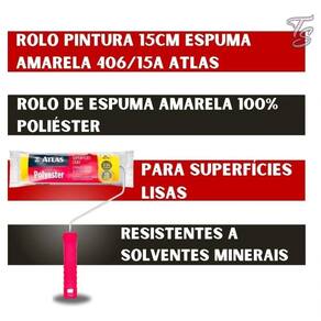 Rolo Espuma Atlas 15cm - 406/15 Rolo de espuma 100% poliéster com densidade 30 (kg/m). Resistente a solventes minerais. Diâmetro de 68 mm, maior retenção de tinta. Indicado para superfícies lisas. Use com tintas esmalte, verniz, acrílica (pva). Produto resistente a solventes minerais, não utilizar com thinner. Ean: 7896380140312