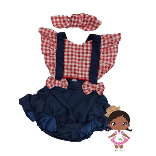 Tecido super confortável, algodão, regulagem de medidas nas alças. Acompanha o laço Veste de 4 a 18 meses