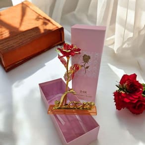 Rosa Vermelha Brilhante Flor Artificial 24k Folha Plástico Na Caixa com Base Love