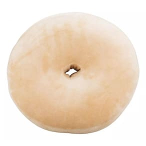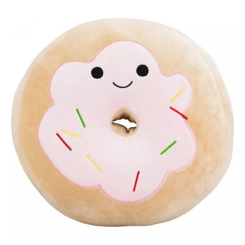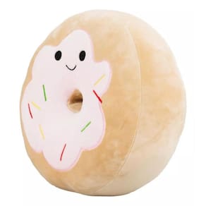 Pelúcia no formato de uma rosquinha com rosto no sabor morango e 32 x 14 x 32 cm de dimensão. Material: poliéster; Enchimento: fibra de poliéster; Produto certificado por Órgão acreditado pela CGCRE do INMETRO