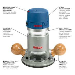 BOSCH Roteador eletrônico de base fixa 1617EVS 2,25 Horesepower com motor de velocidade variável - Base fixa: orifícios roscados para montagem na mesa do roteador posicionados em padrão comum de 3 orifícios; inclui base fixa RA1161 com sistema para ajustar a altura da broca acima de uma mesa de roteador - Durabilidade: a estrutura de alumínio torna este um dos nossos roteadores de madeira mais duráveis, com alças de madeira em uma base fixa e uma alça macia em uma base de mergulho - Fácil de usar: cabos de madeira arredondados maximizam o controle do usuário; ajuste de profundidade de bits microfina - Conveniente: com o circuito de resposta constante embutido, nossa fresadora de madeira 1617EVS manterá uma velocidade constante durante todo o corte, para que você obtenha resultados mais limpos e precisos - Motor de 12 AMP e mostrador de velocidade ajustável: o usuário pode definir a velocidade ideal (8.000-25.000 RPM) para mais ou menos potência - Guia de modelo: compatível com o conjunto de adaptadores de guia de modelo RA1129 opcional para facilitar a troca de guias de modelo de liberação rápida Bosch e guias de modelo rosqueados comuns; inclui adaptador de guia de modelo RA1126 e interface RA1100 para guias de modelo rosqueados - Inclui: base fixa, mandris de pinça de 1/10.2 cm e 1/5.1 cm, chave de eixo, chave de porca de pinça, escudos de lasca, chave de ajuste de altura sextavada com alça T e 3 parafusos 10-24 para montagem em mesa
