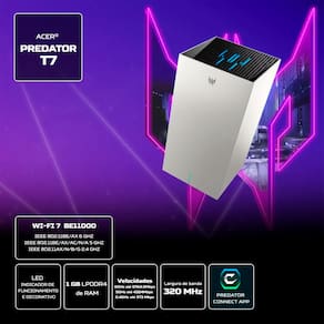 DESCRIÇÃO COMPLETA: Alcance uma nova era de conectividade com o roteador Acer Predator Connect T7 Wi Fi 7 ultrarrápido BE11000 com três bandas simultâneas e baixa latência ideal para jogos streaming e smart homes Equipado com inteligência de QoS e mesh expansível oferece cobertura ampla e prioridade automática para seus dispositivos essenciais.