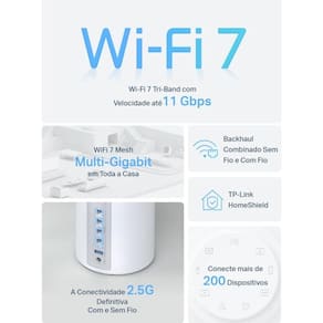 Wifi Tri-Band 11 Gbps - 5764 Mbps 6 GHz + 4324 Mbps 5 GHz + 688 Mbps 2.4 GHz .conexões com Fio de 2.5 Gbps - 4 2.5 Gbps portas garantem máxima flexibilidade e aumento de throughput.Backhaul Combinado Sem Fio e Com Fio - Conecta um backhaul sem fio e com fio com cada unidade simultaneamente para melhorar o throughput geral e reduzir a latência.Operação de Vários Links MLO - Envia e recebe dados simultaneamente em diferentes bandas e canais para aumentar o throughput, reduzir a latência e melhorar a confiabilidade.Canais de 320 MHz - Dobra a largura de banda e permite muitas mais transmissões simultâneas nas velocidades mais rápidas possíveis.Funciona na Banda de 6 GHz - Minimiza congestionamentos com espectro greenfield, proporcionando conexões robustas de alta velocidade.Tp-link HomeShield - Oferece proteção abrangente de rede, controles parentais robustos e segurança IoT em tempo real.Compatibilidade Universal - Compatível com todas as gerações de WiFi e funciona com qualquer provedor de serviços de internet ISP e modem.