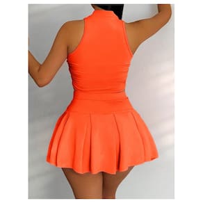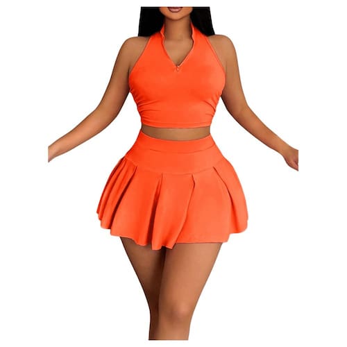 Tabela de tamanhos: (Medidas do produto) PP: Busto: 72 cm, comprimento: 42 cm, ombro: 22 cm, quadril: 78 cm, comprimento: 33,4 cm, tamanho da cintura: 59 a 96 cm. P: Busto: 75 cm, comprimento: 44 cm, ombro: 23 cm, quadril: 82 cm, comprimento: 34 cm, tamanho da cintura: 64 a 99 cm. M: busto: 80 cm, comprimento: 44 cm, ombro: 24 cm, quadril: 85 cm, comprimento: 34 cm, tamanho da cintura: 67 a 102 cm. G: Busto: 85 cm, comprimento: 44 cm, ombro: 24 cm, quadril: 91 cm, comprimento: 35 cm, tamanho da cintura: 74 a 108 cm. Estes dados foram obtidos com a medição manual do produto, pode estar fora de 1-2 cm - O tecido tem elasticidade média, macio e confortável - Conjunto de 2 peças de blusa lisa sem mangas com saia para mulheres - Característica: zíper, gola alta, sem mangas, tops cropped e saia plissada, conjunto de saia de 2 peças para mulheres, cor lisa, moderno - Ocasião: Adequado para uso casual, feriados, fim de semana, treino, tênis, golfe, vida diária e passeios - Recomendação de tamanho: consulte a tabela de tamanhos que fornecemos em nossas fotos (a medida do produto é o tamanho da roupa, NÃO a medida do corpo)