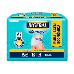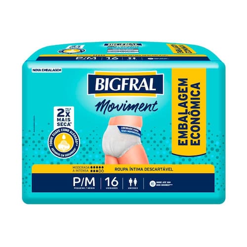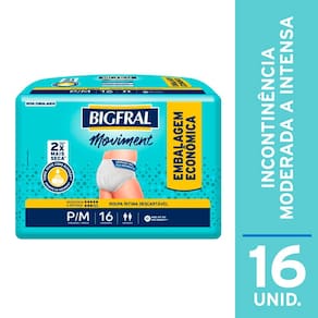 CINTURA ELÁSTICA MODELADORA Cintura elástica que contribui para a melhor adaptação da roupa íntima ao corpo, proporcionando total discrição e conforto.   ABSORVE EM SEGUNDOS* Com camada protetora que mantém a pele seca através de uma rápida distribuição de urina, menor retorno e máxima absorção.   BARREIRA PROTETORA ANTIVAZAMENTO Proporciona proteção extra contra vazamentos, permitindo que você se movimente naturalmente no seu dia a dia.   SISTEMA ANTIODOR Sistema que neutraliza o odor da urina, contribuindo para seu bem-estar.   Bigfral Moviment Feminina é a calcinha descartável ideal para incontinência moderada a intensa. Foi desenvolvida especialmente para mulheres, pois além de ser discreta, tem toque suave como algodão proporcionando maior conforto. Absorve em segundos mantendo a umidade longe da pele e deixando-a até 2x mais seca. As barreiras antivazamento e o controle de até 100% dos odores proporcionam segurança para que você desfrute seu dia e se movimente com confiança.