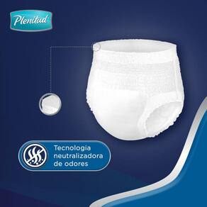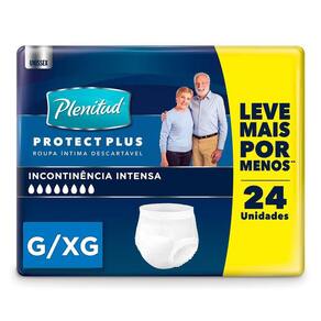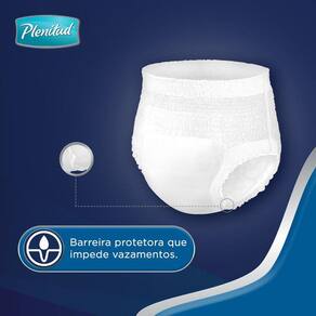 A Roupa Intima Plenitud Protect Plus proporciona maior conforto para quem tem incontinência urinaria deixando sempre seco e com maior praticidade. Promove absorção rápida dos líquidos permitindo maior comodidade ao se locomover. Além de possuir agentes combatendo mau odor durante todo o dia como a pessoa que você ama realmente merece. A Roupa Íntima Plenitud Protect Plus foi desenvolvido com material de qualidade parecido com tecido que oferece o mesmo conforto e discrição da roupa íntima de algodão. A roupa íntima descartável Plenitud Protect Plus traz dignidade para o adulto com pouca mobilidade e torna mais prático o dia a dia do cuidador. Com seu formato anatômico fácil de vestir e tirar e desenvolvido especialmente para pessoas com incontinência intensa, tem a mesma absorção de uma fralda*. Traz ainda benefícios como ajuste ideal ao corpo, controle de odores e material respirável, mais macio* e que permite maior rapidez na troca. O produto é dermatologicamente testado.