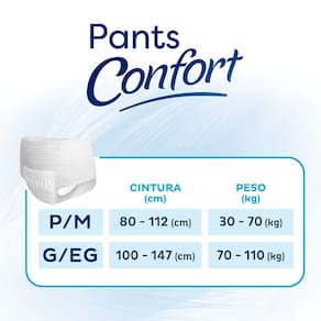 Roupa Íntima Tena Pants Confort P/M 24 Unidades Embalagem Econômica Roupa Íntima Descartável TENA Pants Confort é uma roupa íntima descartável e unissex de rápida absorção, proporcionando ao usuário ativo ou com pouca mobilidade facilidade de uso, discrição e segurança. É indicado para perdas de urina moderada a severa. Núcleo de Ultra Absorção Acquidry; Odour Neutralizer™ - Sistema que neutraliza o risco de odores indesejáveis; Material Macio - suave ao contato com a pele; Mais elásticos em volta da cintura permitindo uma adaptação perfeita ao corpo; Elásticos duplos nas pernas para um melhor conforto e segurança contra vazamentos; Costuras laterais removíveis para retirar o produto com maior facilidade.