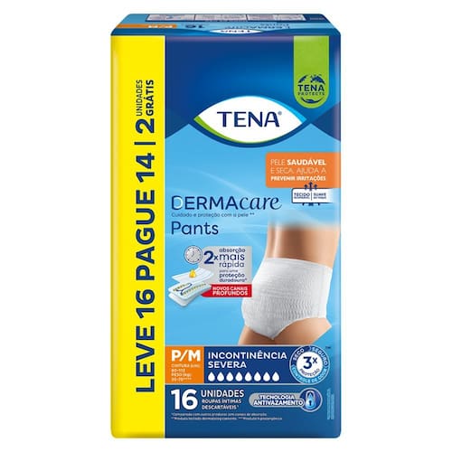 Roupa Intima Tena Pants Dermacare TENA Pants Dermacare é uma roupa íntima descartável e unissex de rápida absorção, que proporciona ao usuário ativo facilidade e praticidade de uso, discrição e segurança. Produto com elásticos em volta da cintura que garante um ajuste perfeito ao corpo. Além da proteção da pele que ajuda na prevenção de irritações, permitindo que a mesma esteja sempre saudável e seca. É indicado para perdas de urina severa. A excepcional segurança deve-se à tecnologia antivazamento que absorve rapidamente mesmo grandes quantidades de urina mantendo-a longe da pele de forma que, mesmo sentado ou deitado durante muito tempo, o usuário permanece seco e confortável, reduzindo significativamente o risco de infecções cutâneas. Um produto hipoalergênico com tecido respirável e macio. Proteção e cuidado para a pele todos os dias. DIFERENCIAIS: Tecnologia anti-vazamento - segurança máxima contra vazamentos; Proteção da pele; Núcleo de Rápida Absorção; Controle de Odores - neutraliza o risco de odores indesejáveis; Material macio, suave e respirável; Elásticos em volta da cintura permitindo um ajuste perfeito ao corpo; Elásticos duplos nas pernas para um melhor conforto e segurança contra vazamentos; Costuras laterais removíveis para retirar o produto com maior facilidade.