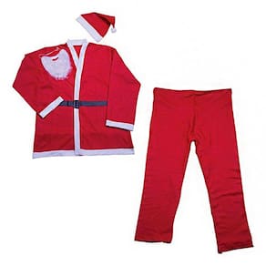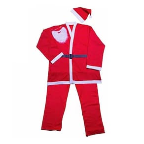 Características: Material: Cetim Poliéster Tecido Brilhante Cor: Vermelho e Branco 5 Peças (Gorro, Barba, Cinto, Calça e Paletó) Tamanho Único Calça Ajustável