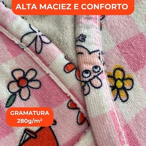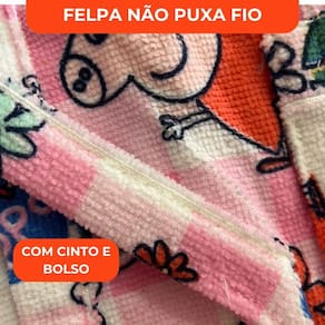 O roupão aveludado da coleção Peppa Pig estampa a adorável porquinha rodeada por flores coloridas, tudo isso em um xadrez rosa que deixa o roupão ainda mais charmoso. Na hora do banho, as crianças embarcam em um mundo de diversão, alegria e conforto acompanhadas da qualidade que só a Lepper oferece. O roupão aveludado é macio, aconchegante e apresenta o verso felpudo, o que garante uma absorção ainda melhor. Essa é a magia dos produtos Lepper na rotina dos pequenos.