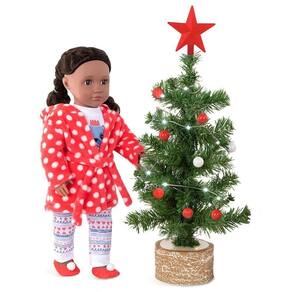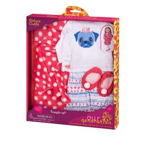 Pijama com roupão de bolinhas para bonecas de 46cm. Bonecas que amam cachorrinhos vão dormir melhor com esse pijama com desenho de um pug. Este adorável pijama e roupão para bonecas é tão fofo quanto um pug e certamente incentivará bons sonhos. A calça do pijama é comprida e com estampa super estilosa e a camiseta também tem mangas compridas. Para manter as bonecas ainda mais quentinhas, um roupão de banho de lã macia, vermelho e branco. Tem um capuz e um cinto para uma diversão extra realista! Os fofos chinelos vermelhos com pompons brancos nos dedos dos pés finalizam o look perfeitamente combinado. Boneca vendida separadamente.
