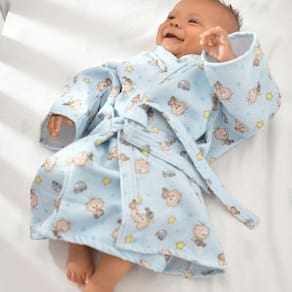 A saída do banho será mais gostosa e divertida com os roupões Turma da Mônica Baby. Confeccionados em tecido felpudo 100% algodão, garantem excelente absorção, toque suave e carinhoso à pele do bebê.