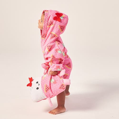 O roupão infantil é uma peça que pode ser usada em diversas situações, como na praia ou na piscina. Feito de tecido absorvente e leve, o roupão infantil é ideal para envolver as crianças após um mergulho, mantendo-as aquecidas e secas. Além disso, o roupão pode ser utilizado para proteger do sol enquanto as crianças brincam na praia ou à beira da piscina.Os roupões são estampados e com capuz, confeccionados em tecido felpa aveludada 100% algodão, garantindo excelente absorção, toque suave e carinhoso à pele do bebê. Possuem cinto costurado nas laterais, para melhor ajuste na amarração. As estampas são alegres e divertidas. As crianças vão adorar!
