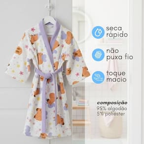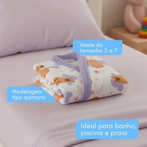 Características: -Tamanho P (veste de 2 a 7 anos) -Modelagem tipo quimono -Estampa divertida da Capivara -Não puxa fio -Secagem rápida -Fácil manutenção