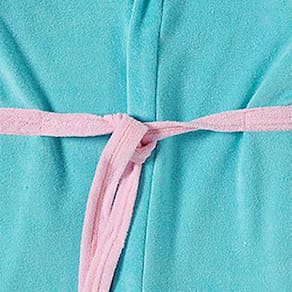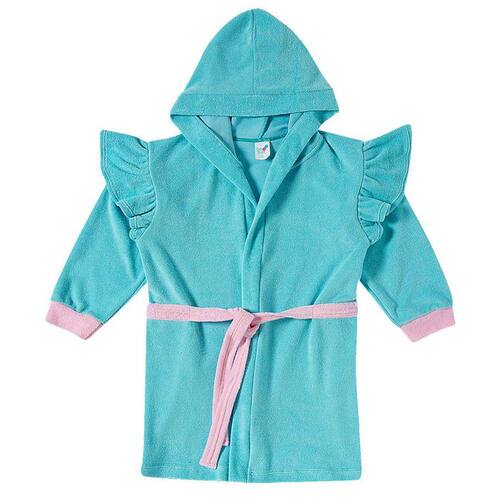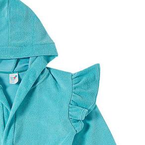 Perfeito para aproveitar os momentos de saída da praia e piscina, o roupão turquesa claro da Tip Top possui capuz, manga longa e é atoalhado. Os detalhes ficam por conta dos babadinhos nos ombros, e os punhos e faixa frontal em rosa.