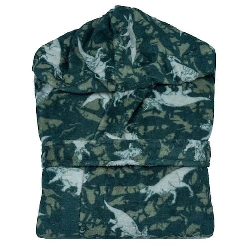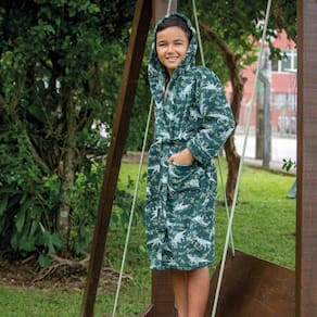 Roupão Infantil Microfibra Sofisticata Kids P Dino C/Capuz O Roupão Infantil Atlântica Sofisticata Dinossauro Verde é quentinho e aconchegante, com capuz, cinta para amarrar na cintura, dois bolsos frontais, manga longa, é perfeito para aquecer nos dias frios. Esse roupão possui toque extra macio e suave confeccionado em microfibra felpuda e promove o máximo de conforto e aconchego durante os momentos de descanso.