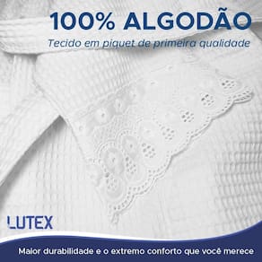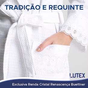 Ele possui a delicadeza exclusiva e tradicional da renda cristal renascença aplicada na manga e bolso do roupão, trazendo aquele visual requintado que você ama.