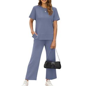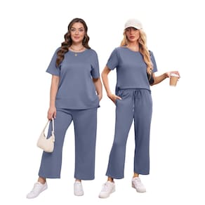 XIEERDUO Conjunto feminino de 2 peças, moda para viagem, fato de treino, confortável, pernas largas, para aeroporto, P-3GG, Azul, 2GG - Tecido leve como o ar/fluxo de ar ideal/elasticidade em 4 direções. As 2 peças são feitas com tecido espaçador leve, macio e ultra drapeado, projetado para parecer sedoso em sua pele. - Gola redonda básica/manga curta/blusa com fenda lateral. Esta túnica confortável é longa o suficiente para cobrir seus quadris, esconder sua barriga - Comprimento curto (9/10)/ Calça com cordão de cintura elástica/calça de moletom de perna larga. Calça com dois bolsos laterais práticos, ajuda a segurar seu celular, chaves, moedas e batons facilmente, pare de se preocupar com onde colocar seu telefone enquanto você está trabalhando/praticando esportes - Pode ser vestido por cima ou por baixo, ótimo para uso casual/vestir-se/férias/viagens/negócios casuais/trabalho/exercícios - Lavar à máquina em água fria, secar em temperatura baixa ou pendurar para secar. Passar a ferro em configurações baixas. A embalagem Acuum pode causar rugas na parte superior, mas lavar ou passar a ferro as refrescará