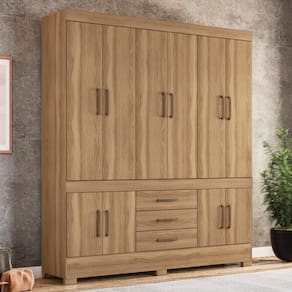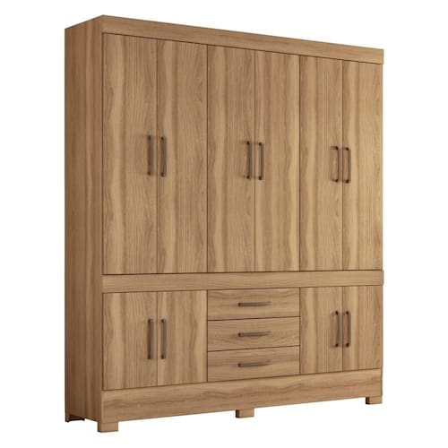 Feito em MDP, possui 3 gavetas, pés em PVC, 10 portas, 4 prateleiras internas e 2 cabideiros.