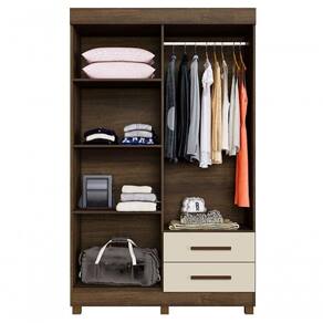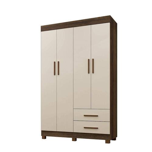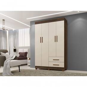Roupeiro Copacabana New 4 Portas 2 Gavetas Benetil Imbuia/off White O Roupeiro Copacabana quatro portas é o móvel ideal para organizar seu quarto e deixá-lo ainda mais prático! Com design clássico, ele possui elementos que dão a ele um toque de modernidade. O design clean deixa o ambiente mais aconchegante. A parte interna ampla possui várias prateleiras, possibilitando o armazenamento de cobertores, travesseiros e outros acessórios. Conta com cabideiro em alumínio, o que garante um suporte para maior peso. As gavetas são externas oferecendo mais espaço e comodidade para organizar as coisas. É a solução para pequenos espaços e perfeito para deixar o quarto mais prático e bonito! Características: Linha: Roupeiro Copacabana Estilo: Moderno Origem do produto: Nacional Matéria-prima da estrutura: MDP Ambiente principal: Quarto De canto: Não Necessita montagem: Sim Possui espelho externo: Não Possui espelho interno: Não Possui pés: Sim, 6. Altura dos pés: 5cm Material dos pés: PVC Possui portas: Sim Quantidade de portas: 4 Tipo de portas: Bater Tipo de puxador da porta: Externo Matéria-prima dos puxadores: PVC Possui prateleiras: Sim Quantidade de prateleiras: 4 Possui gavetas: Sim Quantidade de gavetas: 2 Tipo de gaveta: Externa Tipo de corrediça da gaveta: Telescópica Gaveta com chave: Não Possui cabideiro: Sim Material do cabideiro: Alumínio