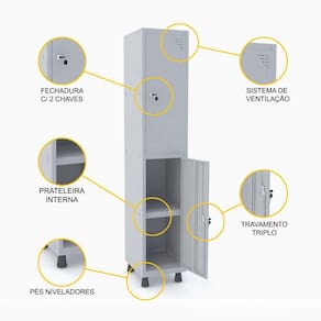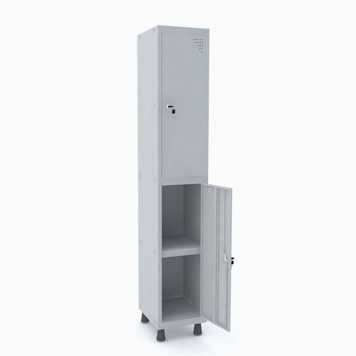 - Roupeiro de aço com 2 portas (uma para cada vão) e uma prateleira interna no meio de cada vão.