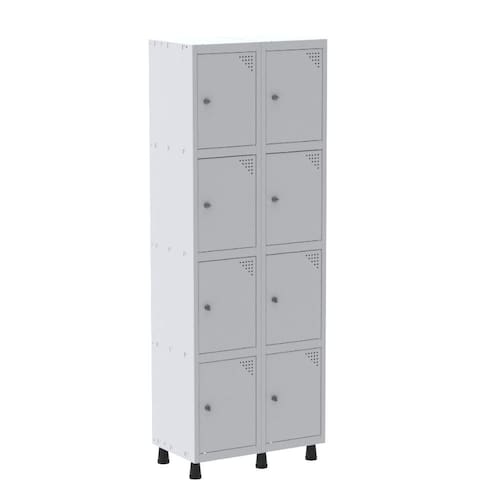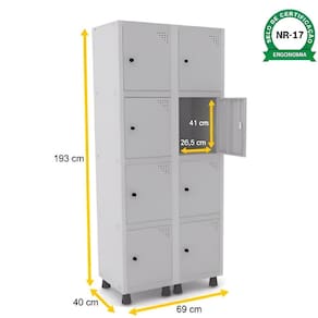 Características Técnicas: Ideal para guarda volumes Veneziana por porta para ventilação Sistema de tranca invertidas que dispensa a utilização de parafusos Confeccionado em chapa de aço n 26 Com tratamento antiferrugem pintura eletrotática Totalmente montável, dispensa a utilização de parafusos Pés removíveis em polipropileno com regulagem de desnível de alto impacto na cor preta Capacidade por prateleira 15kg (bem distribuídos) Com Furação para Ventilação Reforço Interno por Porta Produto de Acordo Com as Normas NR-18 e NR-24 Estrutura Corpo, Laterais e Portas confeccionados em chapas 26 (0,45mm) Este produto será entregue desmontado **