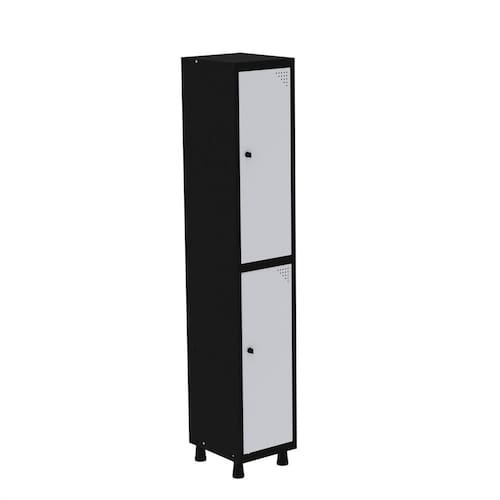 Armário Roupeiro de Aço totalmente montável, dispensa a utilização de parafusos, estrutura em chapas #24 e #26 (0,60mm e 0,45mm) conta com uma porta com estampos circulares em formação triangular para ventilação, sistema de fechamento de varão de 3 pontos, através de pitão para cadeado. Em conformidade com as normas NR17 e NR24, garantindo segurança no ambiente de trabalho.
