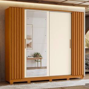 Feito em MDP.Possui detalhes nas portas laterais com acabamento ripado, 4 gavetas com corrediça telescópicas, 4 portas, 2 cabideiros e 10 prateleiras