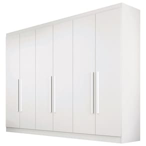 Roupeiro elegante com 6 portas de bater, com dobradiças modernas e reforçadas. Gavetas internas com corrediças telescópicas. Possui puxadores em madeira, excelente espaço interno, Cabideiro em alumínio.