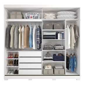 Detalhes que encantam! O produto e produzido 100 em MDF, possui 2 portas de correr, que dispoem de sistema com regulagem para mais suavidade na hora de fechar as portas. Alem de 4 gavetas internas super espacosas, 3 cabideiros para pendurar suas pecas. E o melhor, conta com um espaco exclusivo para guardar seus sapatos, colchas ou o que preferir.