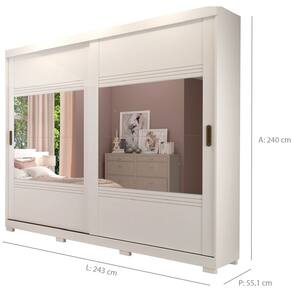 Ficha tecnica: Marca: Panan Modelo: Blumenau Tipo: Casal Tipo de porta: Correr Quantidade de portas: 2 portas Quantidade de gavetas: 4 gavetas Quantidade de cabideiros: 3 cabideiros Sapateira: Sim Espelho: Sim Tamanho do espelho: 101 x 53,8 cm Espessura do espelho: 3 mm Gaveta com chave: Nao Tipo de corredicas: Telescopicas Material da estrutura: MDF Material das portas: MDF Material das gavetas: MDF Material dos puxadores: ABS Pes: Sim Material dos pes: ABS Acabamento: Pintura UV Sistema de montagem: Cavilhas e parafusos Altura: 240 cm Largura: 243 cm Profundidade: 55,1 cm Peso: 240,6 kg Codigo de barras: Avela/Off White 7908184602412 / Cafe 7908184602054 / Branco 7908184602047 / Cinamomo/Off White 7908184604027 / Cacau 7908184604010 Garantia: 3 meses Conteudo da embalagem: 01 roupeiro, acessorios para montagem e manual de instrucoes