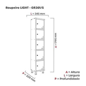 Armário Roupeiro de Aço totalmente montável, dispensa a utilização de parafusos, estrutura em chapas #24 e #26 (0,60mm e 0,45mm) conta com uma porta com estampos circulares em formação triangular para ventilação, sistema de fechamento de varão de 3 pontos, através de pitão para cadeado. Em conformidade com as normas NR17.