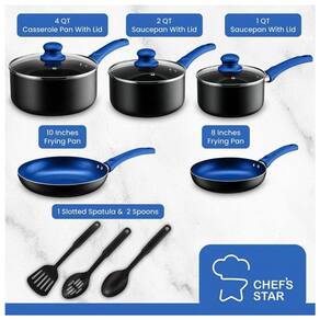 Preocupado com Hot Spots Não seja. Nosso conjunto de panelas e frigideiras é uma panela de indução que possui a tecnologia EvenHeat, para que sua comida seja cozida na medida certa Feito com alumínio de alta qualidade, este conjunto de panelas antiaderente é fácil de limpar e pode ser lavado na máquina de lavar louça. Quem não gosta de coisas de cozinha sem complicações Resistente a arranhões e fácil de segurar, nosso conjunto de frigideira antiaderente possui alças antiderrapantes e fáceis de segurar. As tampas de vidro temperado ventiladas. para colocar no forno, você pode facilmente ir de cozinhar no fogão para cozinhar no forno, assar ou dourar com nossos conjuntos de cozinha para cozinhar em casa First Apartment Must Haves, este conjunto de panela e frigideira antiaderente inicia a cozinha da maneira certa e é um ótimo presente de inauguração ou itens de registro de casamento