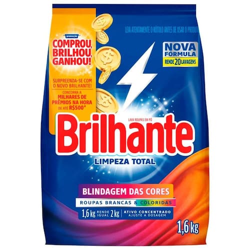 Sabão em Pó Brilhante Roupas Brancas e Coloridas Blindagem das Cores - 1,6 kg limpa as roupas brancas e coloridas enquanto cuida das cores.