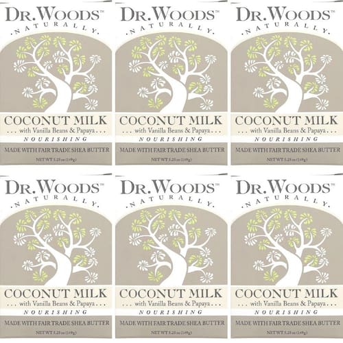 - Dr. Woods O sabonete de leite de coco mistura leite de coco, mamão e favas de baunilha para relaxar seus sentidos, enquanto enriquece sua pele com manteiga de karité orgânica e vitamina E