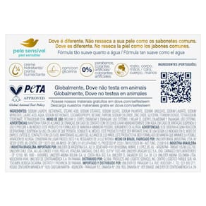 • O sabonete Dove Pele Sensível possui fórmula hipoalergênica com glicerina, 1/4 de creme hidratante e agentes de limpeza suaves que ajudam a manter a hidratação natural da pele. • Esse sabonete possui tecnologia de limpeza Syndet e pH neutro, que ajuda a manter a barreira de proteção natural da sua pele saudável. • Com fragrância suave e 0% sulfatos, parabenos e alergênicos. • Formulação tão suave quanto a água, desenvolvida especialmente para as peles mais sensíveis. • Este sabonete ajuda a repor nutrientes naturais que podem ser perdidos durante o banho. • O Sabonete em Barra Dove Pele Sensível é dermatologicamente recomendado.