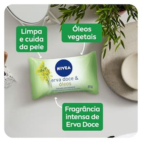 NIVEA Sabonete em Barra Erva Doce & Óleos possui uma fórmula especial que limpa de forma delicada e mantém a pele hidratada mesmo após o banho.