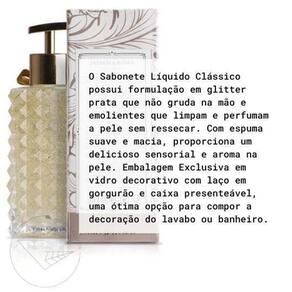 DESCRIÇÃO O Sabonete Líquido Clássico possui formulação em glitter prata que não gruda na mão e emolientes que limpam e perfumam a pele sem ressecar. Com espuma suave e macia, proporciona um delicioso sensorial e aroma na pele. Embalagem Exclusiva em vidro decorativo com laço em gorgurão e caixa presenteável, uma ótima opção para compor a decoração do lavabo ou banheiro. MODO DE USAR