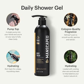MANSCAPED O sabonete líquido UltraPremium é infundido com aloe vera e sal marinho para manter sua pele limpa, fresca e hidratada. Usa uma fórmula limpa, vegana e sem corantes, perfumada com uma autêntica colônia refinada.