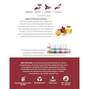 O Kit 2 Sabonetes Em Gel Neutralizadores Cheiro proporciona uma experiência sensorialmente completa ao neutralizar eficazmente odores de , charuto e tabaco nas mãos. Com uma fórmula especial que combina óleo de semente de uva e d'limoneno, este sabonete em gel ajuda a combater os radicais livres produzidos pela fumaça e impregnados na pele. Além disso, deixa as mãos hidratadas e livres dos odores mais insistentes. Este kit inclui 2 frascos de sabonete em gel neutralizador de odores de , charuto e tabaco, cada um com 250ml e válvula pump com clip de segurança. Para usar, basta aplicar o sabonete sobre as mãos secas e esfregá-las com atenção aos dedos e às pontas das unhas. Em seguida, enxágue. Com o Kit 2 Sabonetes Em Gel Neutralizadores Cheiro , você terá mãos livres de odores indesejados e uma sensação de limpeza e frescor. Aproveite essa solução eficaz para neutralizar o cheiro de , charuto e tabaco e mantenha suas mãos sempre perfumadas e hidratadas. Adquira já o seu kit! Marca: Neutraline