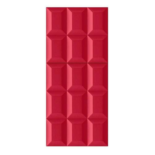 Embalagem: Frasco de 75ml com borrifador, design em forma de barra de chocolate rosa, reciclável.