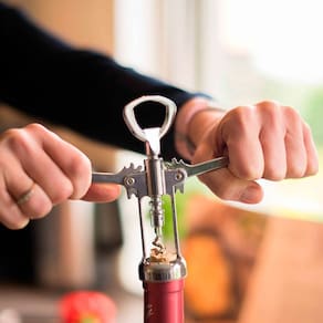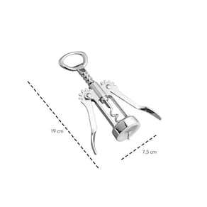 Saca rolha cromado. O abridor de vinho, modelo borboleta é bastante prático, basta girar a alavanca superior para parafusar a espiral na rolha, que as duas alavancas laterais sobem. E ao baixa-las, você retira completamente a rolha. Contem: 1 Saca Rolha Medidas: 19 x 7,5 cm Material: Liga de Zinco